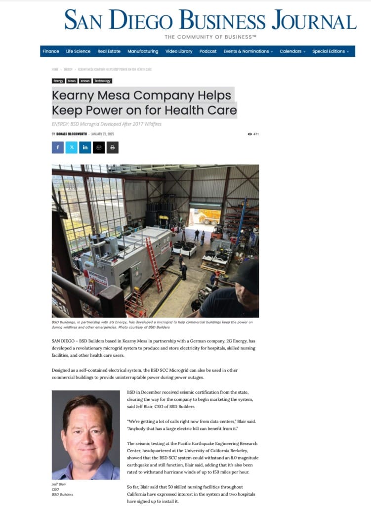 We are proud to announce that BSD Builders, Inc. was recently featured in the San Diego Business Journal for our pioneering work in energy resilience. The article, “Kearny Mesa Company Helps Keep Power on for Health Care,” highlights how our team is solving one of California’s most pressing infrastructure challenges: ensuring continuous power for critical healthcare facilities.